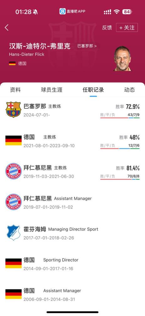 本赛季,弗里克执教巴萨赢得西甲、国王杯和西班牙超级杯三座国内冠军,欧冠闯入四强,截至目前带队59场比赛,战绩43胜7平9负。