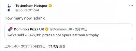 热刺回应达美乐披萨调侃:自上次夺冠后,你们卖出了多少披萨?