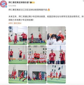 5月22日讯 根据拜仁慕尼黑俱乐部官博的消息,拜仁慕尼黑武汉江汉区足球训练营再度开启。