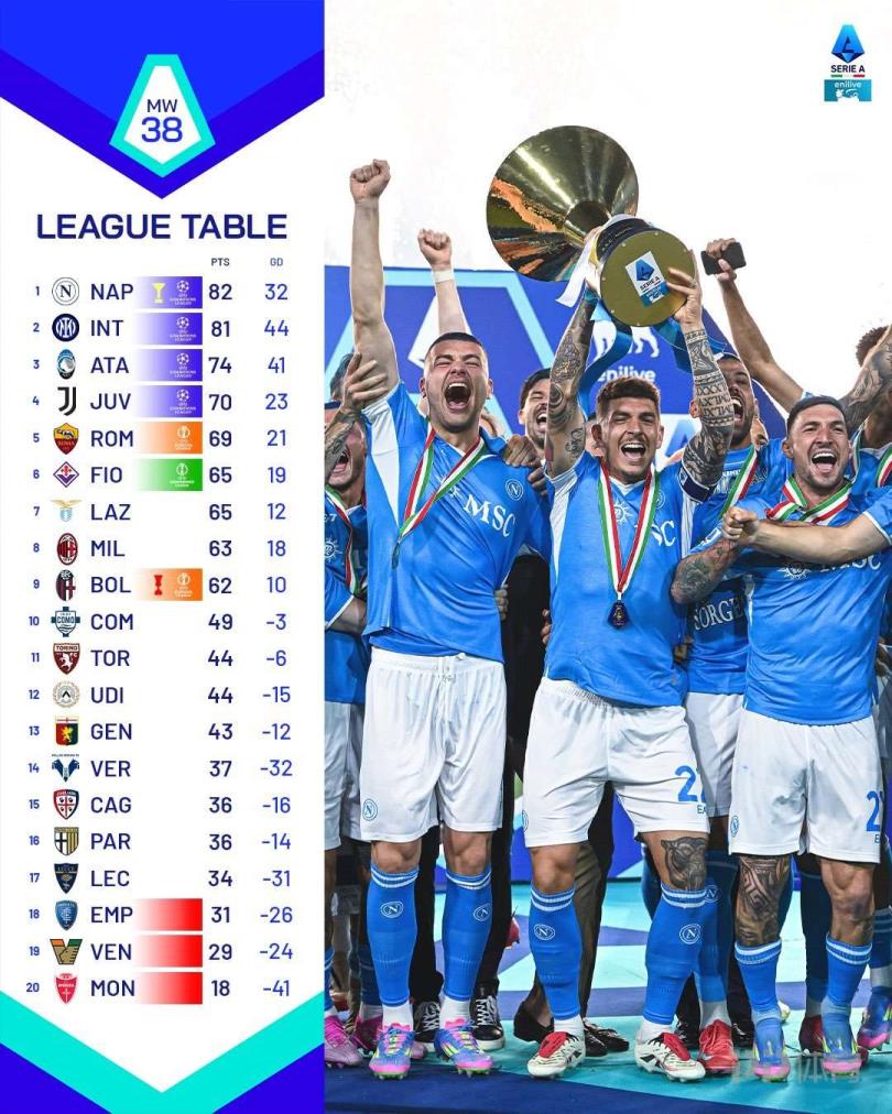 本赛季意甲,那不勒斯以82分夺得冠军,国米、亚特兰大和尤文分列2-4名,获得欧冠资格。第五的罗马和意大利杯冠军博洛尼亚获得欧联杯资格,佛罗伦萨升第六获欧协联附加赛资格。