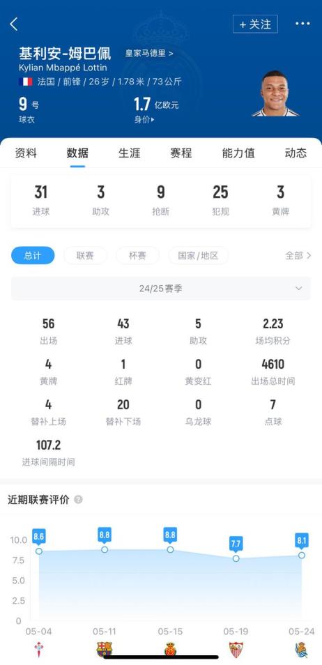 姆巴佩获皇马赛季最佳球员称号,56场43球5助攻创纪录