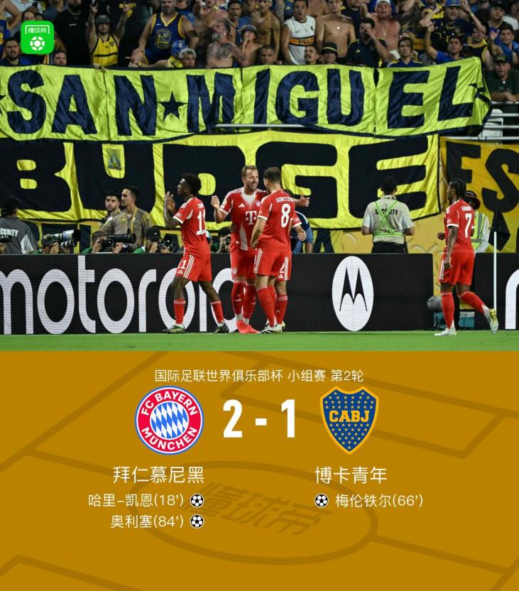 北京时间6月21日,国际足联世界俱乐部杯小组赛第二轮,拜仁慕尼黑与博卡青年 较量。上半场,奥利塞角球直接破门,因格纳布里犯规在先被取消。随后,凯恩低射打破僵局。下半场,梅伦铁尔扳平比分,穆西亚拉因伤被穆勒换下。凯恩助攻,奥利塞搓射得分。全场比赛结束,拜仁2-1战胜博卡青年,提前一轮从小组出线。